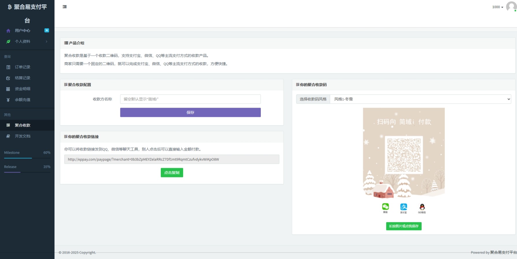 聚合易支付是XX公司旗下的免签约支付产品,完美解决支付难题,支持一站式接入支付宝、微信、银联、QQ钱包、快钱等主流支付渠道,让您拥有PC网页支付、扫码支付、手机APP支付、移动HTML5支付、微信公众号支付。通过简单的页面配置,可以替代复杂繁琐的人工资金结算业务,提高业务实时性,降低错误,帮助开发者快速集成到自己相应产品,效率高,见效快,费率低!是目前最新的版本。此版本是全开源版,唯一加密文件也进行开源处理, 上传压缩包至根目录,解压后直接安装即可, 完成输入域名安装即可访问。